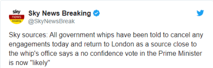 "Всем правительственным координаторам сказали отменить любые обязательства на сегодня и возвращение в Лондон... голосование за вотум недоверия премьер-министру теперь "вероятно", – сказано в сообщении.