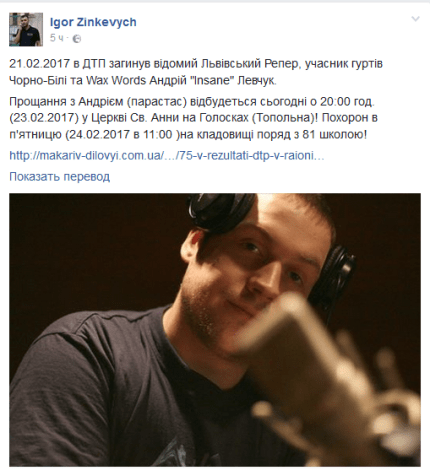 Известный львовский рэпер, участник групп "Черно-белые" и Wax Words Андрей Левчук (Insane) погиб в автомобильной аварии.