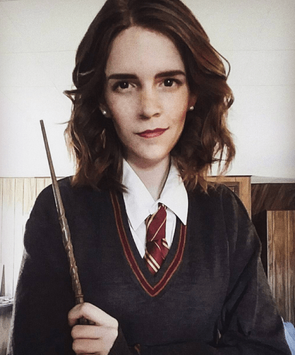 На фото Кэрри позирует в образе Гермионы из "поттерианы", в форме школы Хогвартс и держит в руке "волшебную палочку".