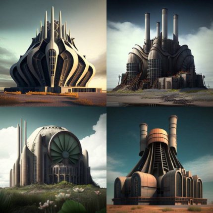 На четырех сгенерированных нейросетью фотографиях, вместо привычного для нас дизайна АЭС, возвышаются якобы фабрики из мультфильмов или сказок.