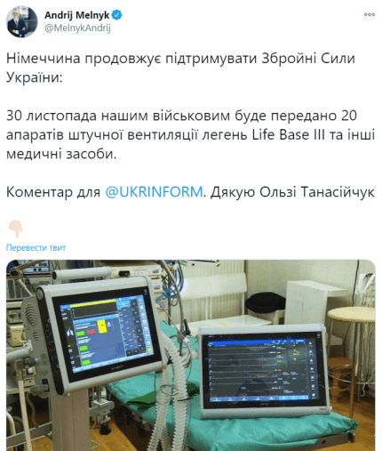 "Германия продолжает поддерживать Вооруженные Силы Украины: 30 ноября нашим военным будет передано 20 аппаратов искусственной вентиляции легких Life Base III и другие медицинские средства", - сообщил Мельник.