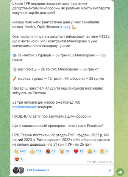 Отмечается, что отчеты по закупочным ценам на продукты были обнародованы представителями воинской части А1225, находящейся в ведении ГУР.