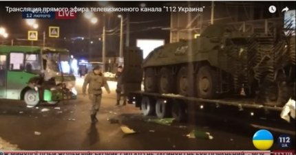 В Харькове вечером 11 февраля маршрутка врезалась в тягач с бронетранспортерами.