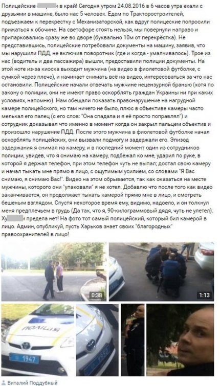 "Полицейские начали отвечать мужчине нецензурной бранью. После этого мужчина начал оскорблять полицейских, они вызвали подмогу и задержали его. Эпизод задержания я снимал на камеру, и в последний момент один из сотрудников полиции, увидев, что я снимаю на камеру, подбежал ко мне, ударил по руке, достал свою камеру и начал тыкать мне прямо в лицо, с ощутимым усилием, со словами: "Я Вас снимаю, я снимаю Вас!", - добавил Поддубный.