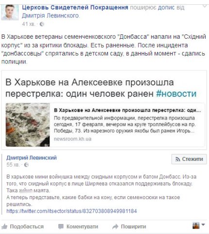 Информацию о конфликте из-за блокады Донбасса подтверждает "Громадське Харків", а также пользователь Дмитрий Левинский.
