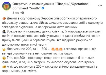 Два чека по 200 и 1 – 300. Яркие впечатления от ужина получили совсем не уважаемые гости заведения. Тот, что 300, теперь улучшает свое состояние, не только финансовое, в одной из больниц временно оккупированного Крыма. А уложившиеся в 200 – так же эпически будут вкладываться и в черные мусорные мешки, – рассказывают представители ОК "Юг".