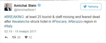 В Италии в результате землетрясения в провинции Пескара на отель Rigopiano, в котором находились люди, сошла снежная лавина.