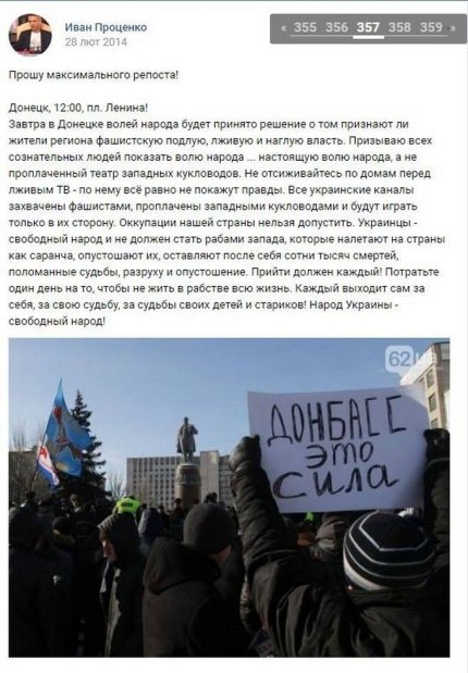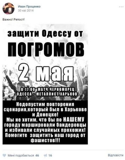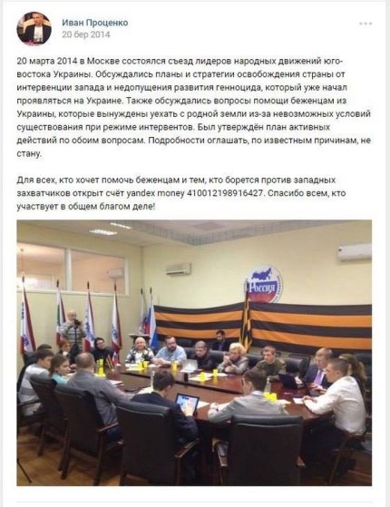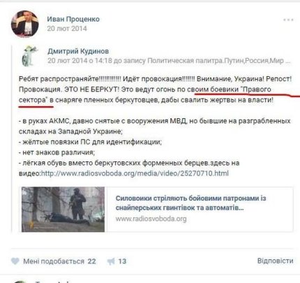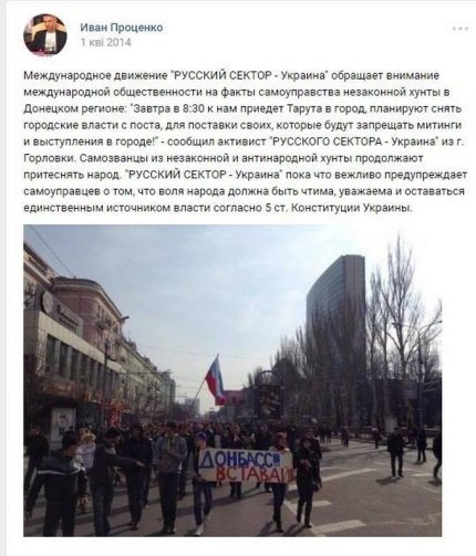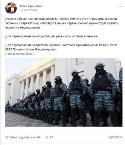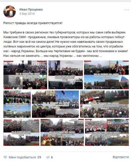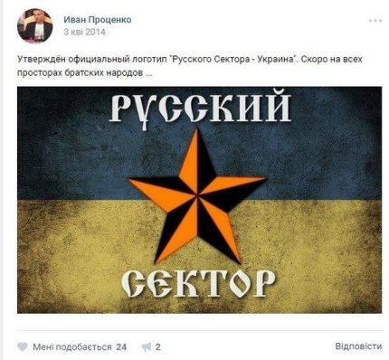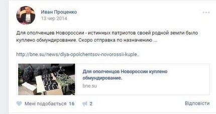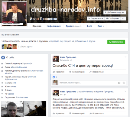 Также приводится несколько скриншотов его откровенно антиукраинской деятельности в соцсетях. Примечательно, что после задержания Иван Проценко поблагодарил в Facebook С14 и "Миротворец".