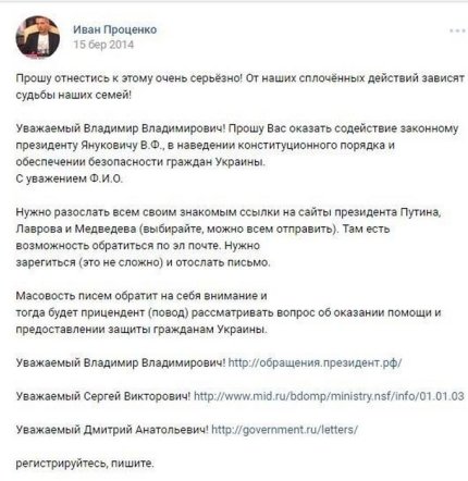 делал неоднократные обращения к президенту РФ Владимиру Путину ввести войска на территорию Украины;
