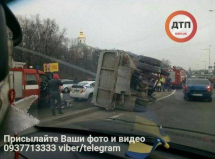 Сообщается, что на киевской набережной перевернулся грузовик. На съезде с Дарницкого моста водитель грузовика не справился с управлением и опрокинулся на бок. От полученных травм водитель погиб.