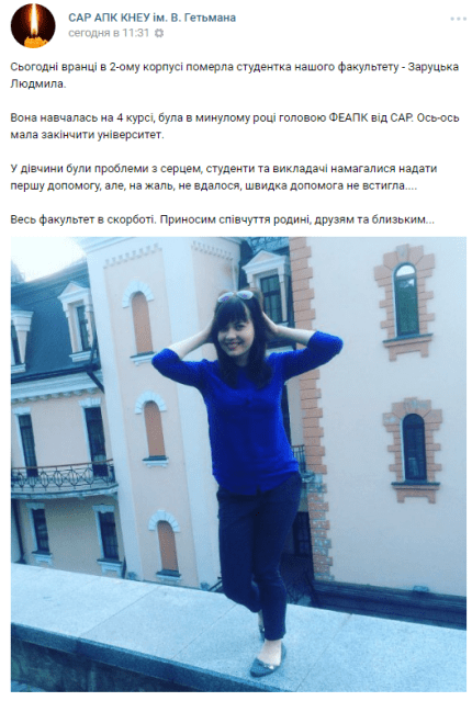 Утром 19 декабря студентка Киевского национального экономического университета имени В. Гетьмана Людмила Заруцкая умерла во время занятий.