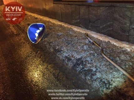 В Киеве водитель, находясь в состоянии алкогольного опьянения, въехал в дорожный знак и отбойник, после чего перевернулся на бок.