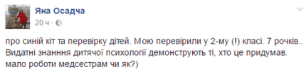 "Мою проверили во 2-м (!) классе. 7 годиков. Выдающиеся знания детской психологии демонстрируют те, кто это придумал. Мало работы медсестрам или как?" - написала Яна Осадчая.