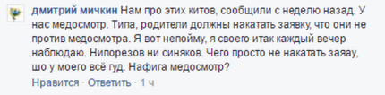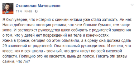 "Я был уверен, что истерия с "Синими китами" уже стала затихать. Ан нет. Наша доблестная полиция решила, что чем больше бумаги, тем чище *опа. И заставляет руководства школ собирать с родителей заявления о том, что у детей нет повреждений на теле и конечностях. Жена в трансе, сегодня об этом объявили, а в среду она должна сдать 29 заявлений от родителей. Она классный руководитель. И ничего, что класс, как и вся школа - заочный, что дети живут по всей Киевской области. Полицию это не касается, вынь да полож. Писать эти заявы самим, что ли?" - написал Матюшенко.