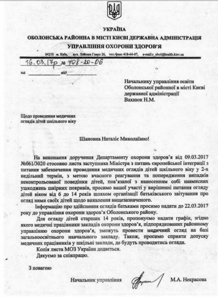 Помимо прочего, киевлянка Алина Хоменко опубликовала в сети письмо из Управления здравоохранения, в котором говорится о медпроверках детей от шести лет.