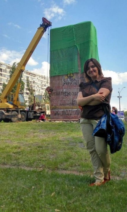 "Рядом стоит автокран, рабочие говорят, что кран - для плит из цоколя, сейчас же потолок не будут снимать, потому что еще не придумали как. Кран приехал за глыбами с фундамента. Саму стелу будут сносить завтра, но как именно - еще не знают, будут сейчас исследовать арматуру в основании памятника. из надежных источников узнала, что это все делается в состоянии истерики и припадка", - написала журналистка.