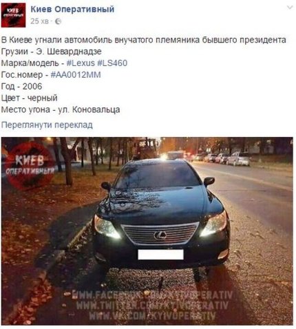 Как пояснили в сообществе, владелец угнанного автомобиля Lexus LS460 2006 года выпуска приходился бывшему президенту Грузии внучатым племянником. Угон произвели на улице Коновальца в центре столицы.
