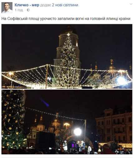 Зажигание огней на главной елке страны произошло в 19:00, причем во многих других городах Украины оно произошло параллельно с Киевом. Мэр Киева опубликовал первые фотографии ёлки в Киеве: