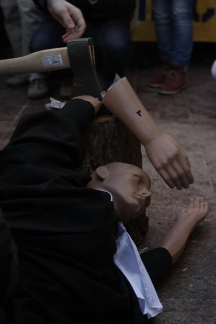 Во время акции митингующие зажгли 2 дымовые шашки. Они также устроили импровизированный суд над судьями-взяточниками, использовав для этого манекены, одетые в судейские мантии. Одному "судье" активисты отрубили руки, второго - повесили, а третьего - сожгли.