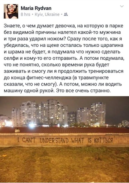 Вечером 19 июля в Киеве неизвестный в парке КПИ напал с ножом на редактора украинского Forbes Марию Рыдван.