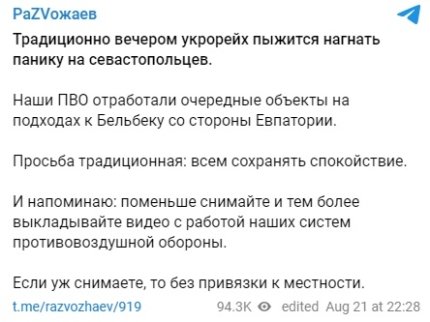 Наши ПВО отработали очередные объекты на подходах к Бельбеку со стороны Евпатории, – написал так называемый "губернатор Севастополя" Михаил Развожаев.