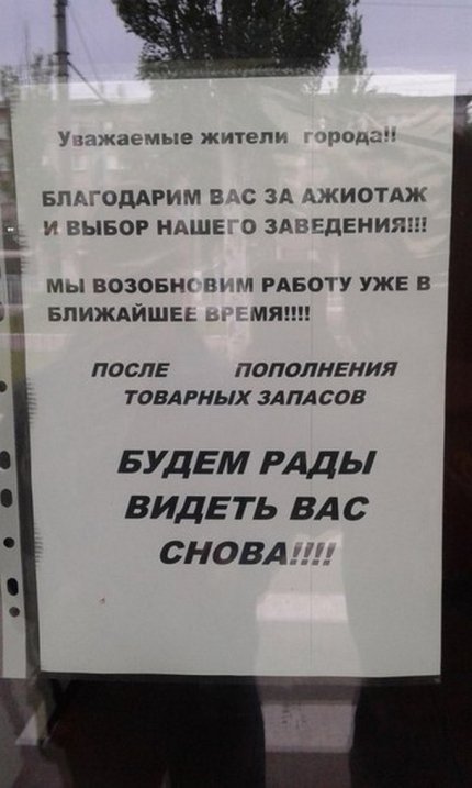 В луганском кафе быстрого питания "Бургер" объявили о приостановке работы в связи с окончанием продуктовых запасов.