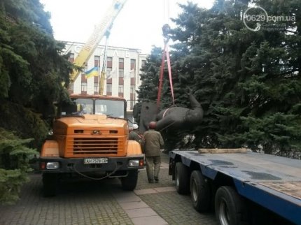 В 9.00 утра памятник был снесен с постамента вместе с плитой, на которой стоял. Демонтаж проходил под тройной охраной.