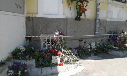 Цветы лежат у стены сгоревшего здания, где висит мемориальная доска с именами погибших в 2014 году, при этом среди букетов есть и цветы с лентами с флагом России.