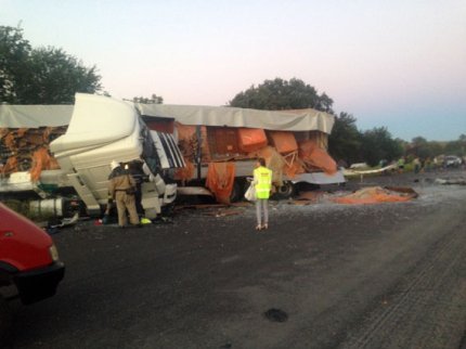 В результате столкновения DAF отбросило на встречную полосу, где грузовик столкнулся с еще одной машиной той же марки, которой управлял 49-летний водитель.