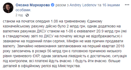"По состоянию на начало августа на гривневом Едином казначейском счете действительно было 2 млрд грн, однако дополнительно на валютных счетах ГКСУ по состоянию на 1 августа есть эквивалент 20,9 млрд грн (которые в стандартном отчете по ГКСУ в начале месяца не отображаются) и, исходя из ежедневного плана августа, Минфин не имел причин продавать валюту. Конечно, невыполнение запланированных на первый квартал 2018 года заимствований в размере 56 млрд грн является главной причиной низкого уровня гривневого ЕКС", - написала Маркарова.