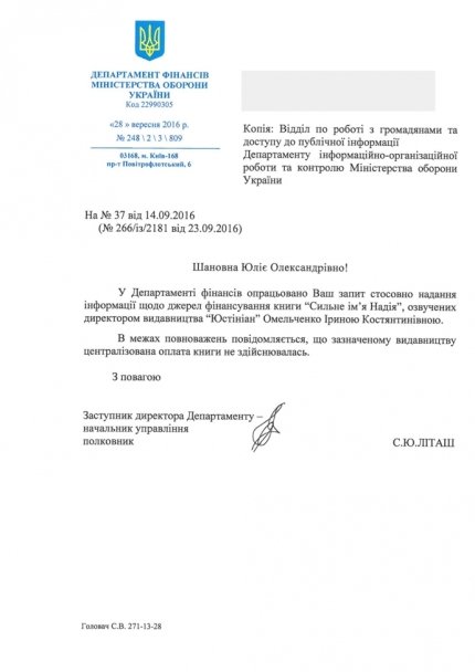 "В Департаменте финансов обработан Ваш запрос о предоставлении информации об источниках финансирования книги "Сильное имя Надежда", озвученных директором издательства "Юстиниан" Омельченко Ириной Константиновной. В рамках полномочий сообщается, что указанному издательству централизованная оплата книги не осуществлялась", - говорится в сообщении.