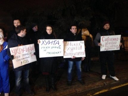 Некоторые из надписей на плакатах, которые вынесли митингующие россияне: "Хунта, руки прочь от русских", "Украина, ты больна! Опомнись! Что ты творишь?", "Украина! Руки прочь от посольства России", "Киевская хунта! Допрыгаетесь", "Савченко - убийца российских журналистов".