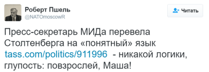 После таких слов Захаровой Роберт Пшель посоветовал ей "повзрослеть": "Пресс-секретарь МИДа перевела Столтенберга на "понятный" язык. Никакой логики, глупость: повзрослей, Маша!", - написал он.