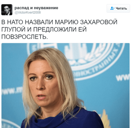 Директор информационного центра НАТО в России Роберт Пшель жестко ответил официальной представительнице Министерства иностранных дел РФ Марии Захаровой из-за её хамства касательно заявления генерального секретаря НАТО Йенса Столтенберга.