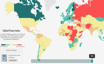 В "рейтинге миролюбия" Украина оказалась в десятке худших стран, упав на 156 место с 162, и оказавшись в пятерке стран, где за 2015 год показатель миролюбия упал сильнее всего.