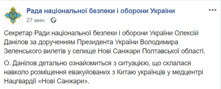 "Секретарь Совета национальной безопасности и обороны Украины Алексей Данилов по поручению президента Украины Владимира Зеленского вылетел в поселок Новые Санжары Полтавской области. Данилов подробно ознакомится с ситуацией, сложившейся вокруг размещения эвакуированных из Китая украинцев в медцентре Нацгвардии "Новые Санжары", - говорится в сообщении.