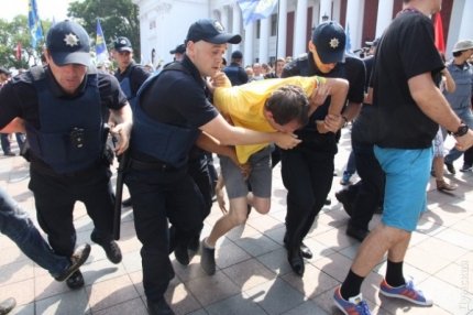 В Одессе участники акции против мэра Геннадия Труханова и проекта по разделению территории города на зоны, подрались с полицией, пытаясь проникнуть на сессию горсовета.