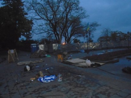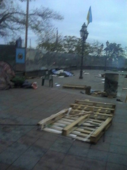 В соцсети также сообщают, что в 3.55 утра к палаточному лагерю подъехал микроавтобус, которому был открыт шлагбаум, из которого вышли люди, вооруженные палками с металлическими наконечниками, типа булавы, с цепями и начали крушить лагерь, срывать плакаты, выбрасывать все через забор, поливать бензином, брызгать газом. Координировал действия по рации Евгений Резвушкин, лидер одесского Автомайдана. В эту ночь веб-камера, которая на Думской была отключена.