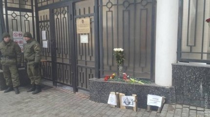 Издание отмечает, что пророссийски настроенные одесситы принесли под здание генконсульства несколько букетов цветов, в то время как проукраинские активисты принесли связку дров-чурок и листы с соболезнованиями касательно того, что Чуркин скончался до суда над ним.