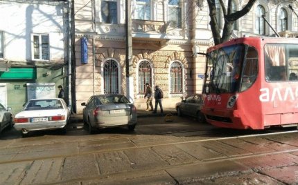 Жители Одессы решили самостоятельно разобраться с автохамом, который заблокировал движение трамваев, и сдвинули его машину.
