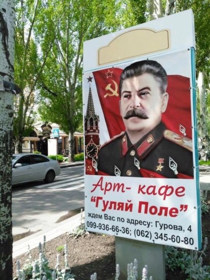 Во временно оккупированном Донецке появилась безграмотная с точки зрения соответствия историческим фактам «реклама» кафе «Гуляй-поле» с изображением Иосифа Сталина, в соцсетях активно иронизируют над уровнем образования пророссийских боевиков.