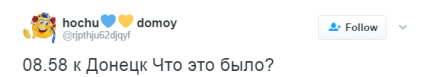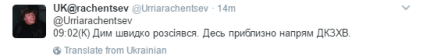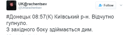 "Донецк 8:57 (К) Киевский р-н. Ощутимо ударило. С западной стороны поднимается дым. 9:02 (К) Дым быстро рассеялся. Приблизительно направление ДКЗХИ", - пишет местный житель в Twitter.