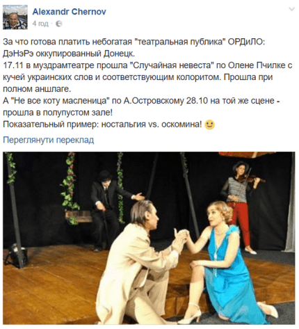 Блогер пояснил, что 28 октября на постановку "Не всё коту масленица" российского драматурга Александра Островского в Донецком музыкально-драматическом театре зрителей пришло в два раза меньше.