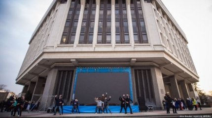В частности, у здания бывшего Верховного Совета Автономной республики Крым, с захвата которого российскими спецназовцами началась аннексия полуострова , на центральной площади Симферополя развешивают флаги и устанавливают сцену для будущего концерта.