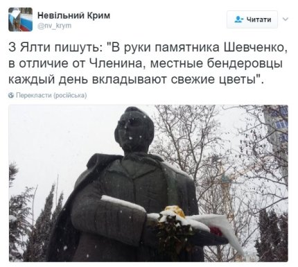 Так, пользователь Невільний Крим обнародовал фото памятника известному украинскому писателю Тарасу Шевченко в Ялте, в руки которому местные патриоты каждый день вкладывают свежие цветы. В частности, внимание акцентировалось на отсутствии такого жеста по отношению к памятнику советскому лидеру Владимиру Ленину.