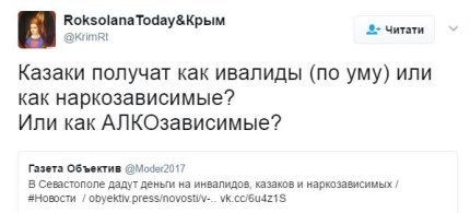 Отметим, что в сети высмеяли решение "властей" оккупированного крымского города. Так, пользователь RoksolanaToday&Крым поинтересовался в Twitter: "Казаки получат как ивалиды (по уму) или как наркозависимые? Или как АЛКОзависимые?".