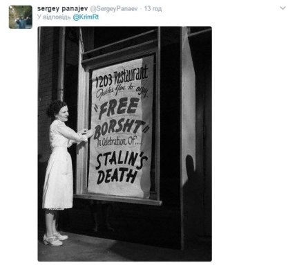 "Сталин для нас сегодня – это наше боевое знамя, которое укрепляет веру в победу и даёт нам силу для преодоления любых трудностей. Возрастающий авторитет Иосифа Сталина в России и во всем мире не остановить никому. И в Севастополе скоро появится памятный знак, где каждый севастополец сможет отдать дань уважения этому великому человеку", - заявил бывший руководитель севастопольского отделения Компартии Украины, перебежавший в КПРФ, Василий Пархоменко.