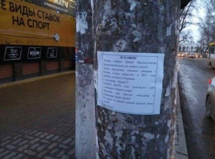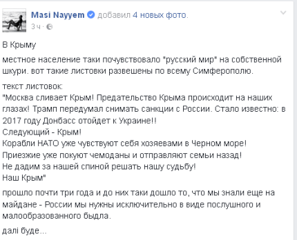 "В Крыму местное население таки почувствовало "русский мир" на собственной шкуре. Вот такие листовки развешены по всему Симферополю", - сообщил он.