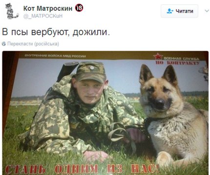 Блогер, пишущий под ником Кот Матроскин опубликовал фотографию, на которой изображен солдат с собакой и размещена подпись "Стань одним из нас".