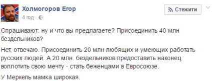 "Спрашивают: ну и что вы предлагаете? Присоединить 40 млн бездельников? Нет, отвечаю. Присоединить 20 млн любящих и умеющих работать русских людей. А 20 млн бездельников предоставить наконец воплотить свою мечту - стать беженцами в Евросоюзе", - написал Холмогоров.